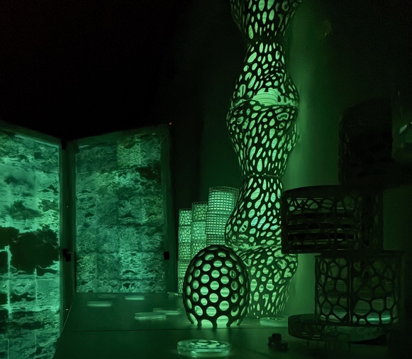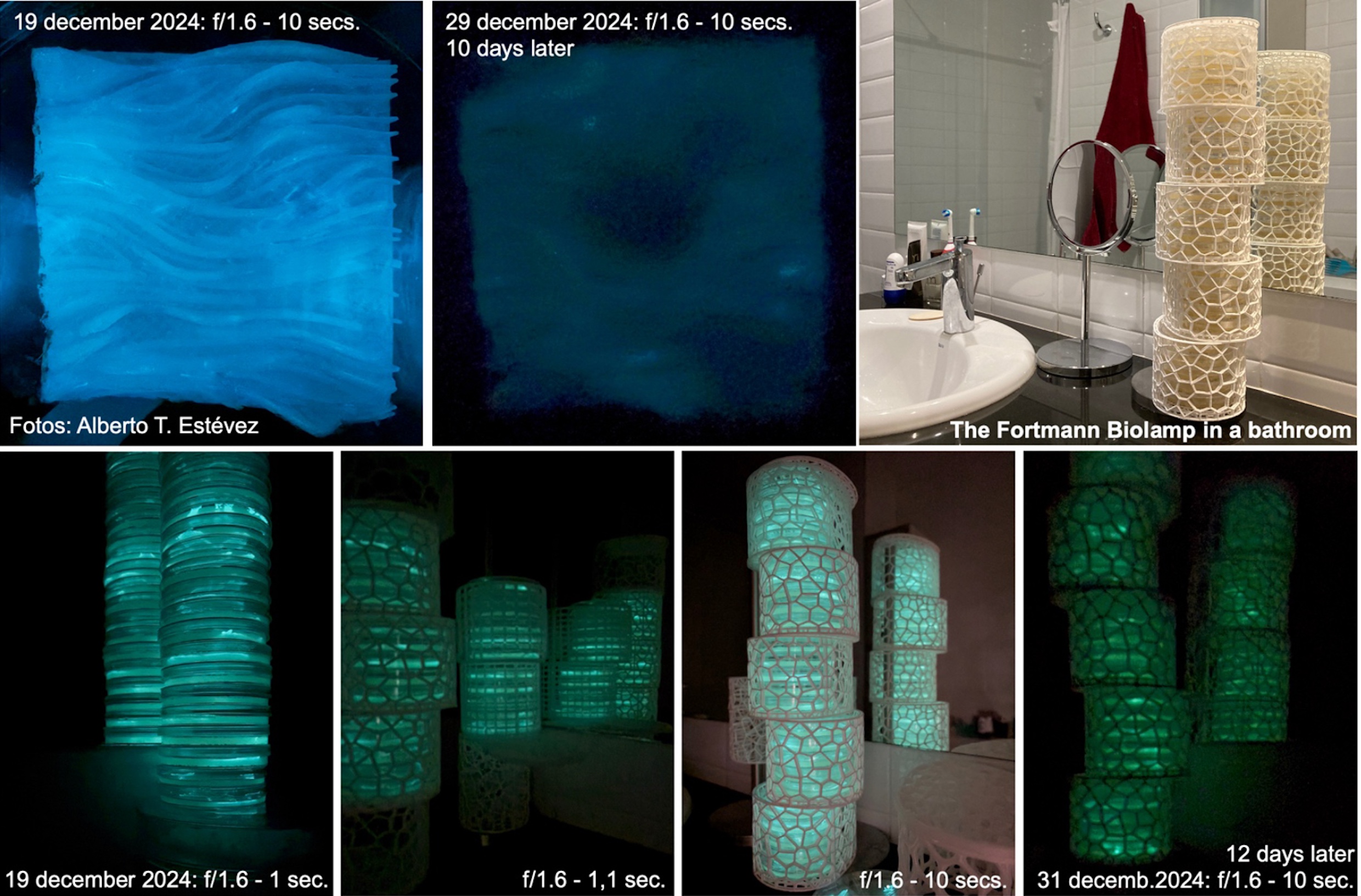 Neben Wandpaneelen für Fassaden und Schaufenster entstanden auch Biolampen für Wohnungen – 3D-gedruckte Leuchtobjekte, in die Petrischalen mit leuchtenden Bakterienkulturen eingesetzt werden. Ein Prototyp mit vier Einheiten und insgesamt 20 Petrischalen reagierte in einem dunklen Raum innerhalb weniger Sekunden mit sichtbarem blaugrünem Licht.